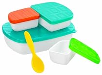 Whether you are at home, Grandma's, daycare or "on-the-go" with your toddler in tow, this nine-piece feeding set is great for any feeding occasion. It includes one large sectioned feeding dish with lid and three removable individual dishes with lids that are perfect for snacks or smaller feeding portions. It also includes a toddler feeding spoon that easily stores in the large lid. BPA-free! Age: 6 months +
