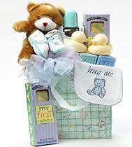- We start with a handy insulated diaper bag and fill it with necessities such as a soft plush teddy bear, adorable baby booties, baby bottle, embroidered baby bib, every ones favorite rubber ducky and ABC block bath toys.